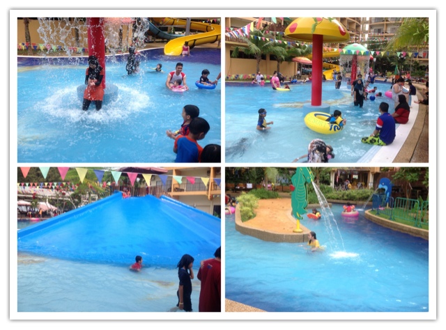 Petang tu kitorang terjun water park kat situ. Best giler! Tempat luas. Tapi banyak tempat kanak-kanak la. Sebaik dah ada anak, seronok siket. Kalau baru kawin pergi sini, tak syok kot sebab takleh main over sangat. Ada anak apa adehal. Hihihihi. Annaila pulak berapa kali tertenggelam dalam air. Ngaaaaaa. Sebab main gelongsor-gelongsor tu kitorang kekadang terlepas peluk Annaila. Hihihi. Ini kalau mak aku atau mertua ada, kompem kena bebel. Takpe depan dorang, kitorang sopan. Lembut je membelai Annaila. Cer belakang-belakang, macam dinasour kitorang kerjakan Naila. Miahahaha~ Annaila macam biasa happy je walaupun termasuk dalam air. Bila angkat dia, tersengih je. Fuhhhh! Semangat. Kena ajar dia berenang ni. Persoalannya mak bapanye pun tak reti berenang, ada hati nak ajar anak. Phuiii. Ok la kita pergi kelas berenang ye nak.